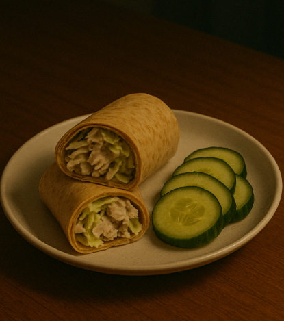 - 구성: 닭가슴살 80g + 통밀 또띠아 1장 + 양배추채 + 오이 슬라이스