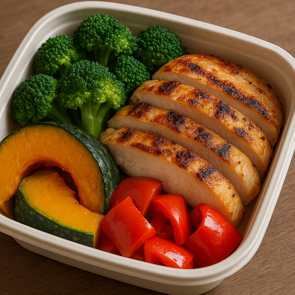 - 구성: 닭가슴살 120g + 현미밥 100g + 구운 단호박, 브로콜리, 파프리카
